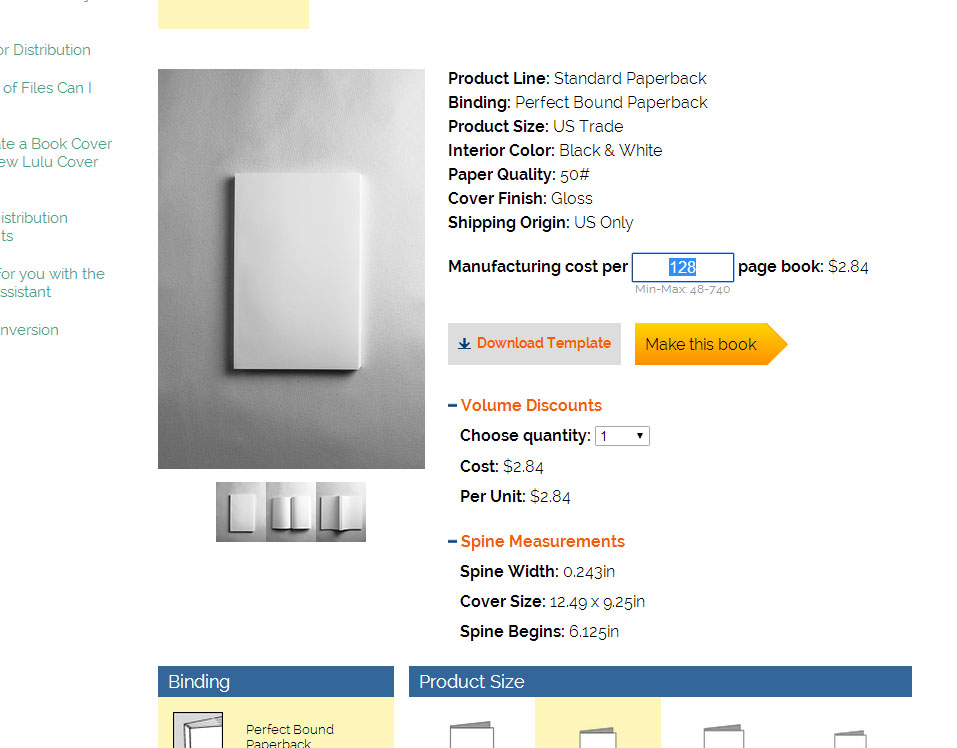 As of April 8, 2015, this is what Lulu.com’s Create A Book Page looks like. It’s very helpful in setting up your book before you piece it together and send it to them. You can view the page at http://www.lulu.com/create/books. I think this will be more useful because the Lulu.com forums and help pages tend to be out-of-date and there is a lot of inconsistent advice.